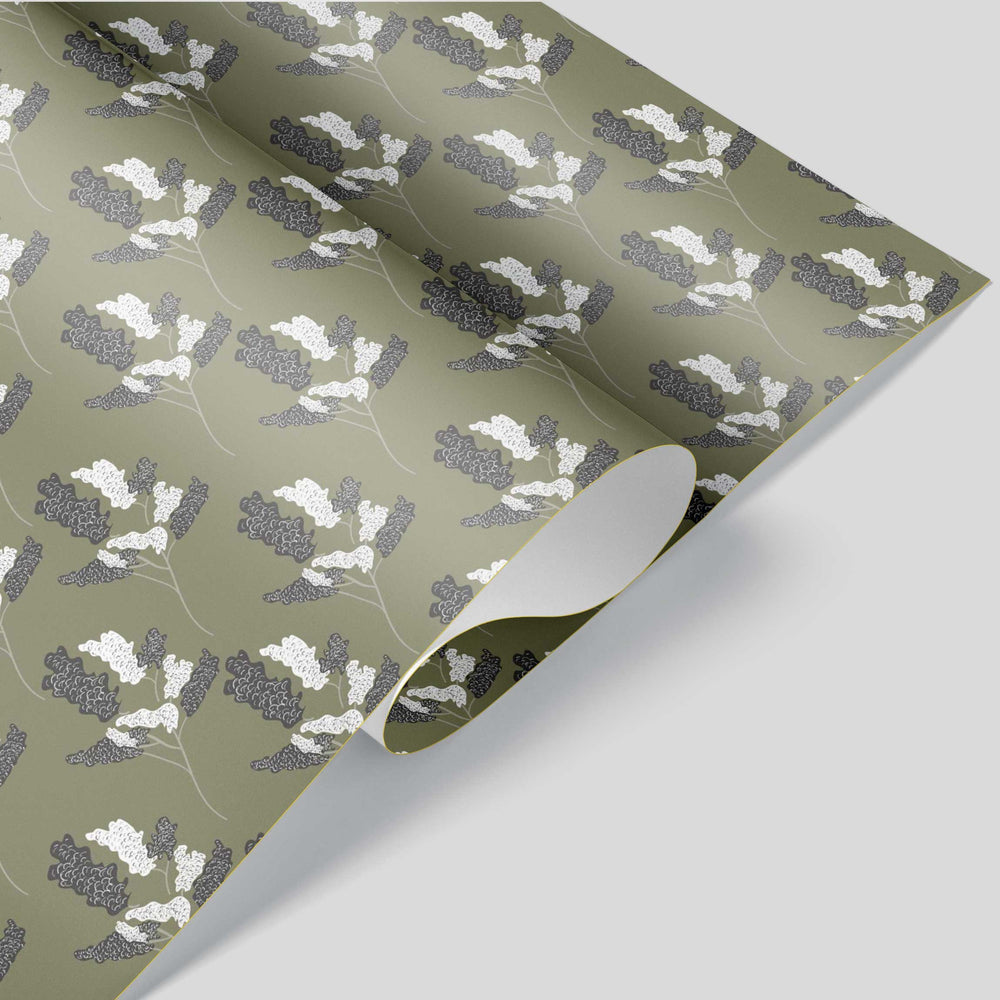 A moody yet refined floral, Wicker Park 1 features black and white wild blooms scattered over an earthy olive green background. This wrapping paper brings a grounded elegance to any gift, making it perfect for understated celebrations or nature-inspired gifting moments.