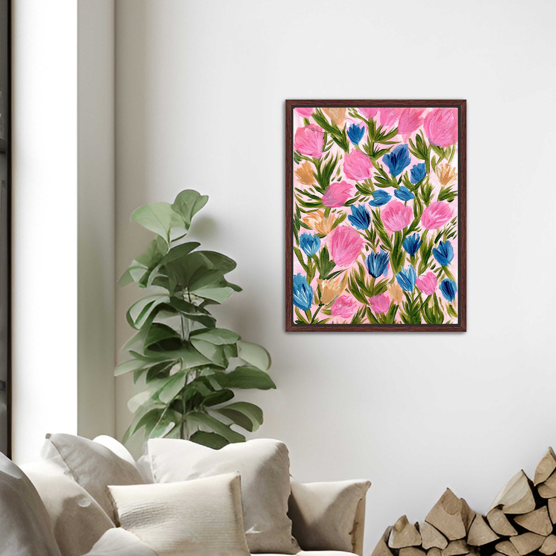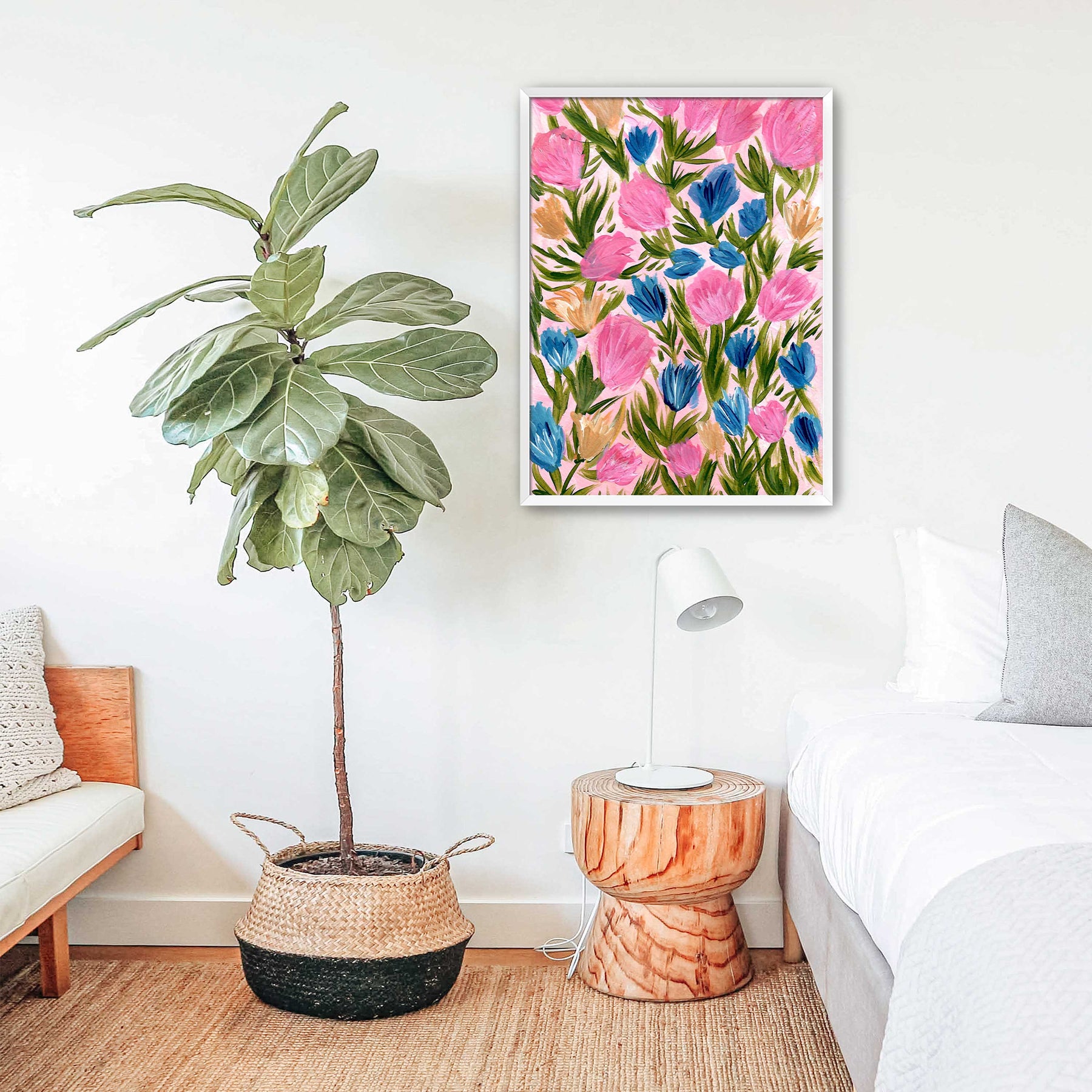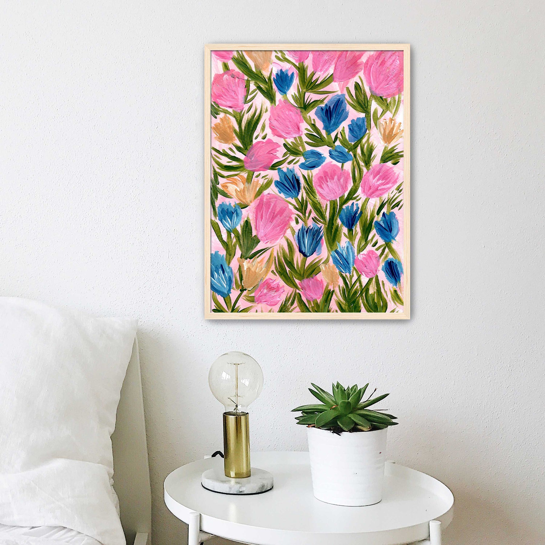 Wildflower Waltz is a vibrant celebration of color and movement, where pink blossoms and bold blue petals weave through layered green stems against a soft blush backdrop. The florals feel playful yet intentional, each brushstroke visible and expressive, giving the painting a sense of rhythm and flow. Warm neutral accents add contrast and balance, allowing the composition to feel lively without overwhelming the eye. This vertically oriented artwork is available as a fine art print or canvas reproduction.