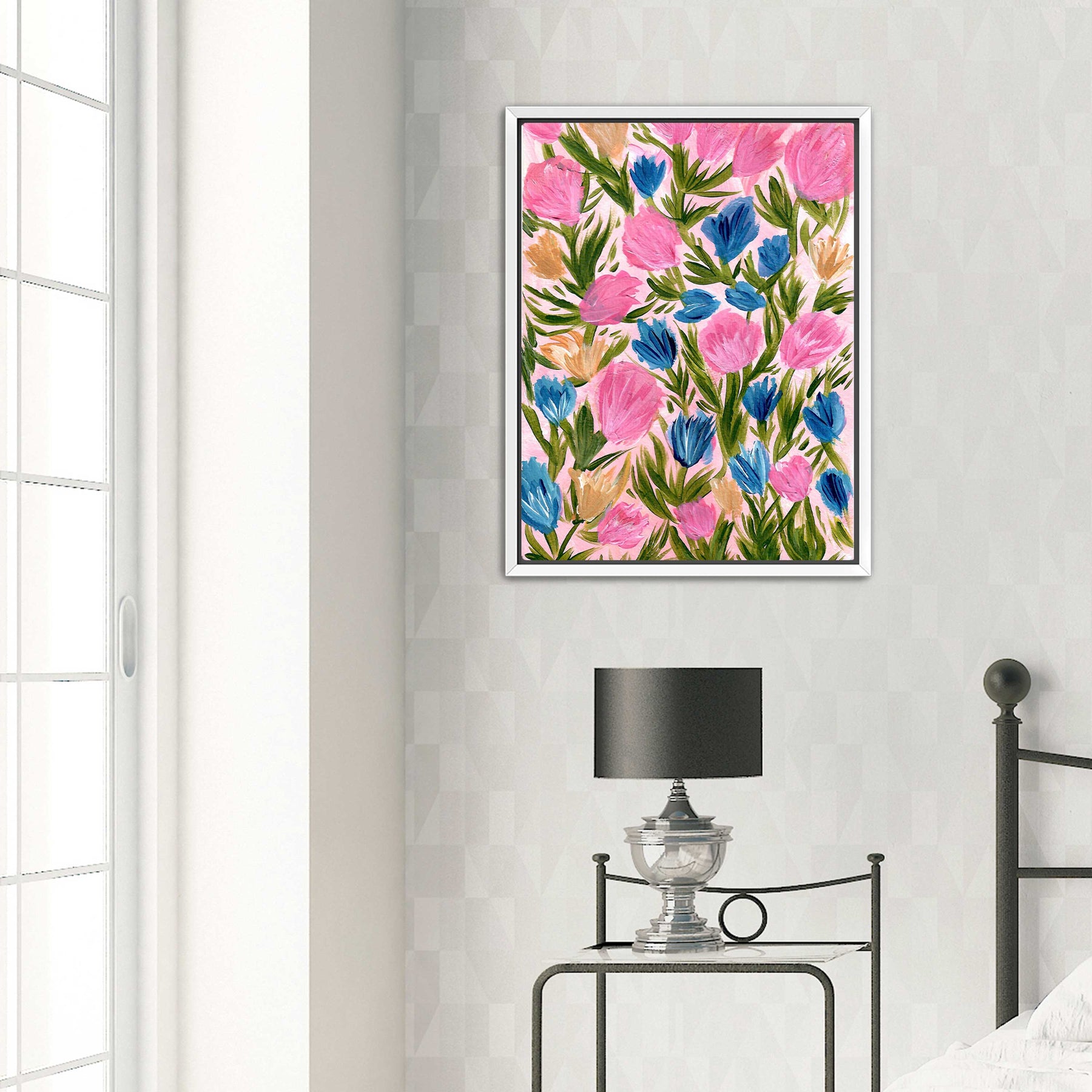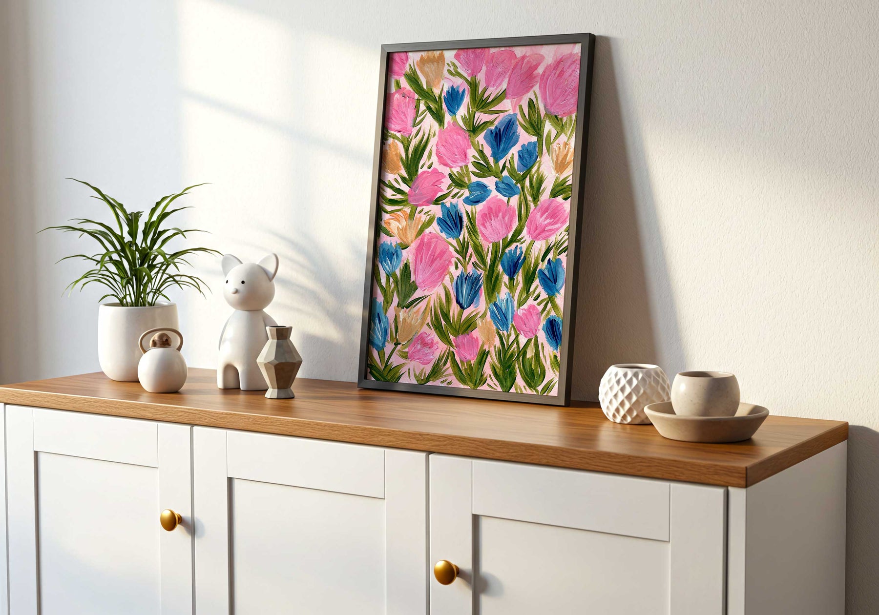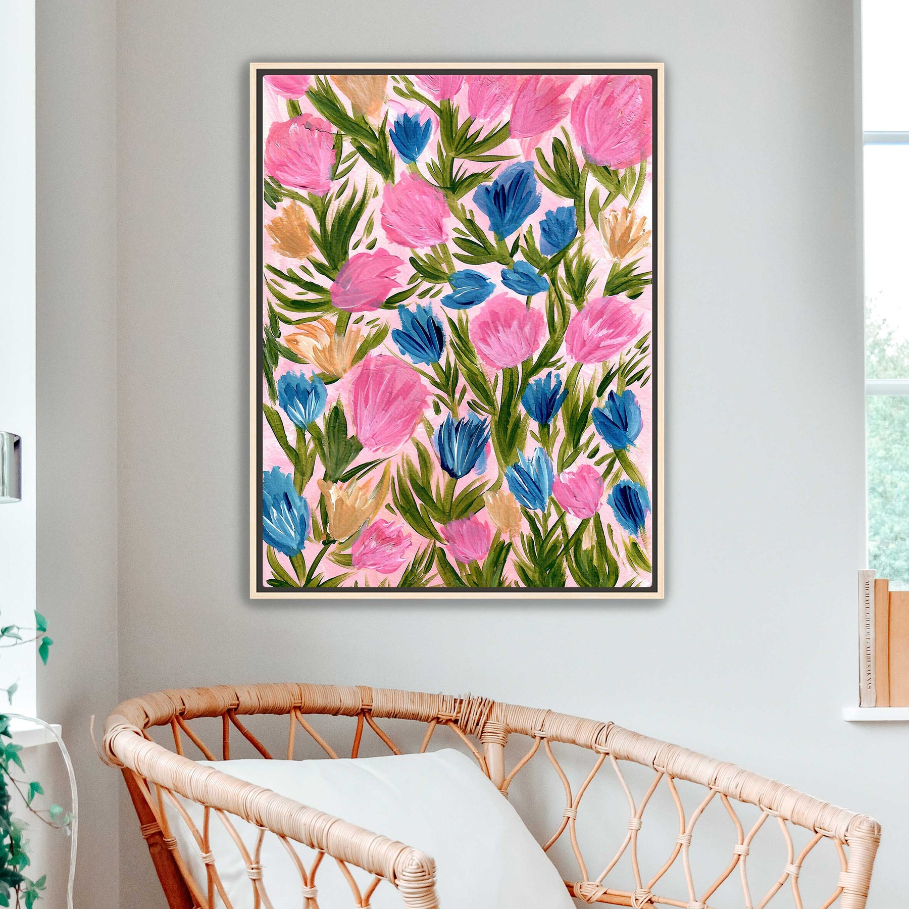 Wildflower Waltz is a vibrant celebration of color and movement, where pink blossoms and bold blue petals weave through layered green stems against a soft blush backdrop. The florals feel playful yet intentional, each brushstroke visible and expressive, giving the painting a sense of rhythm and flow. Warm neutral accents add contrast and balance, allowing the composition to feel lively without overwhelming the eye. This vertically oriented artwork is available as a fine art print or canvas reproduction.